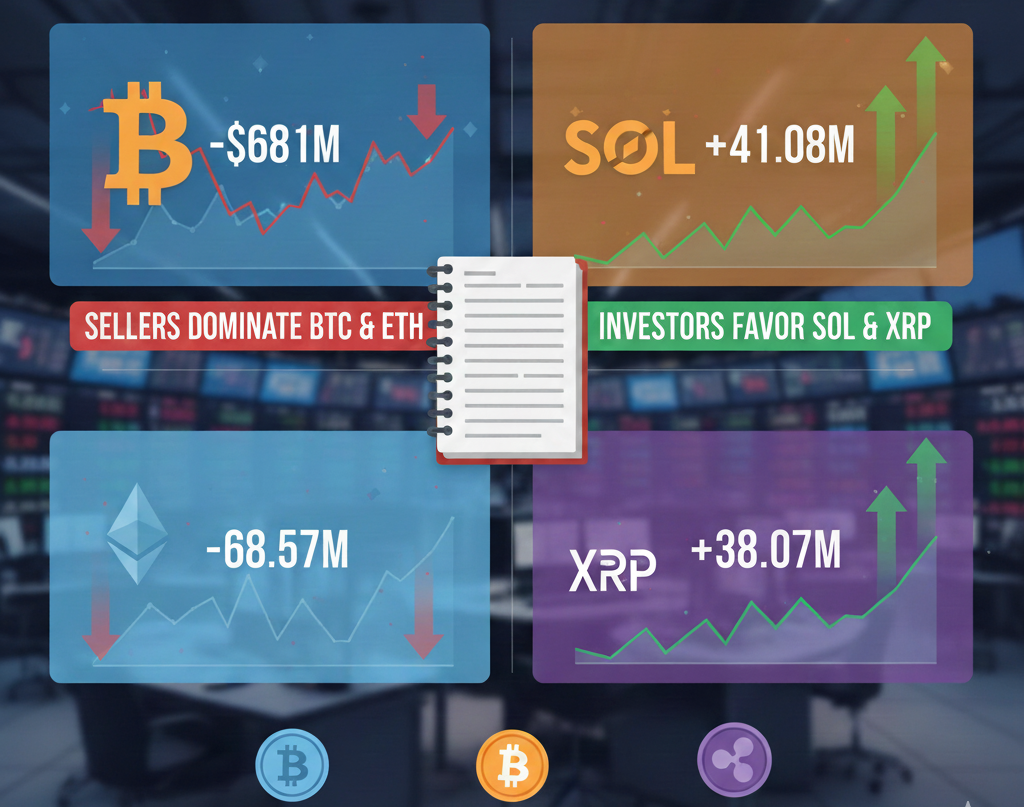 From January 5 to January 9 (ET), Bitcoin ETFs saw $681 million leave, meaning more people were selling than buying. Ethereum ETFs also had some money go out, about $68.57 million. Meanwhile, SOL ETFs gained $41.08 million, and XRP ETFs added $38.07 million, showing that investors were putting more money into these coins.